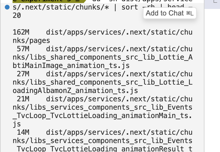 v8이 js 파일을 파싱하는 중에 oom(out of memory)가 발생하고 있어여 그래서 dist에 저장되는 .next의 파일들 중 메모리 청크가 가장 높은 파일들을 발라내보면??